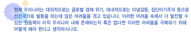 후진적 정치문화, 애매한 법치주의, 열악한 공중 도덕, 환경오염, 안전 불감증, 상호불신, 부정 부패 등, 내가 말 하지 않아도 잘 알고 있지 않습니까?
