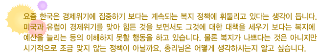 우리나라는 5대 사회보험 (국민연금, 건강보험, 고용보험, 산재보험, 노인요양보험) 과 1개 공적 부조제도(기초생활보장법)를 가지고 있습니다. 그러나 사회보장의 제도적 구색은 선진국 못지않게 다 갖추고 있으나 내용이 부실하다는 데 문제가 있습니다. 특히 사회복지제도는 빈곤층 구제를 위한 사회안정망의 역할을 해야 하는데, 오히려 빈곤하기 때문에 (보험료를 납부하지 못하거나 가입하지 않는 등) 복지제도의 혜택대상에서 제외되고 있는 경우가 많습니다. 그래서 사회보장 제도의 사각지대를 없애는 것이 급선무이고 그를 위해서도 막대한 예산이 필요한데, 정치권은 이미 만들어 놓은 것을 보완할 생각은 하지 않고 전면적 무상급식 등을 들고 나오는 것은 Populism의 본보기라 생각합니다.