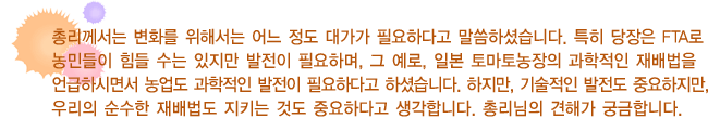 그러나 그러한 낭만을 떠나 모든 사람들이 싼 값으로 토마토를 먹을 수 있도록 농업의 생산성을 제고하는 것은 필요한 일이 아니겠습니까?