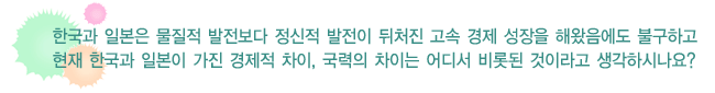 일본은 19세기 중반에 명치유신(明治維新)을 통하여 봉건사회를 청산하고 천황 친정 형태의 통일국가를 형성시킨 다음 서양의 문물을 받아드려 개혁을 추진한 반면, 한국은 19세기 말까지 이조 봉건체제하에서 외부 세계로부터 차단된 “은둔의 나라”로 머물러있었고, 이조 말엽에. 김옥균(金玉均), 박영효(朴泳孝) 서재필(徐載弼) 등이 개화 운동을 벌였으나 조선(朝鮮)왕조의 정치적 무력과 일본의 침략으로 개화주의는 빛을 보지 못했고 결국 우리 민족은 36년간 일제의 식민통치하에서 신음해야 했습니다. 따라서 한국은 근대화와 발전이 늦어진 것은 당연합니다. 그러나 1960년대부터 한국은 고도성장을 계속하여 일본을 거의 따라잡게 되었습니다. 근대사를 공부하세요.