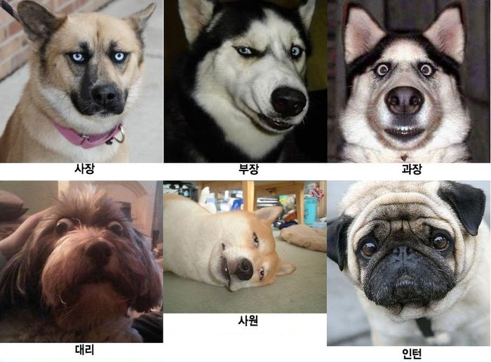 최근 한 온라인 커뮤니티 게시판에는 개의 표정으로 사장, 부장, 과장, 대리, 사원, 그리고 인턴의 모습을 형상화한 사진이 게재돼 네티즌의 눈길을 사로 잡고 있다.