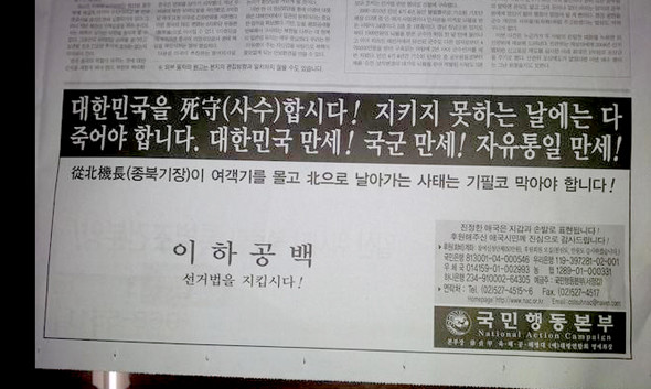 일종의 선거관리위원회에 대한 항의표시성 광고다. 조선일보에서도 좌파에 찍힐까봐 광고문안 한 단어 한 단어에 신경쓴다고 한다.원래 광고하고자 한 내용은 무엇인지 찾아봤다. 국민행동본부 홈페이지에 오면 볼 수 있다.