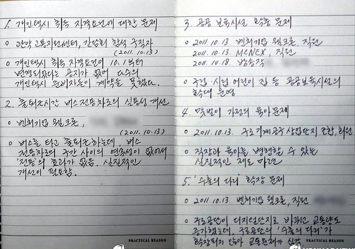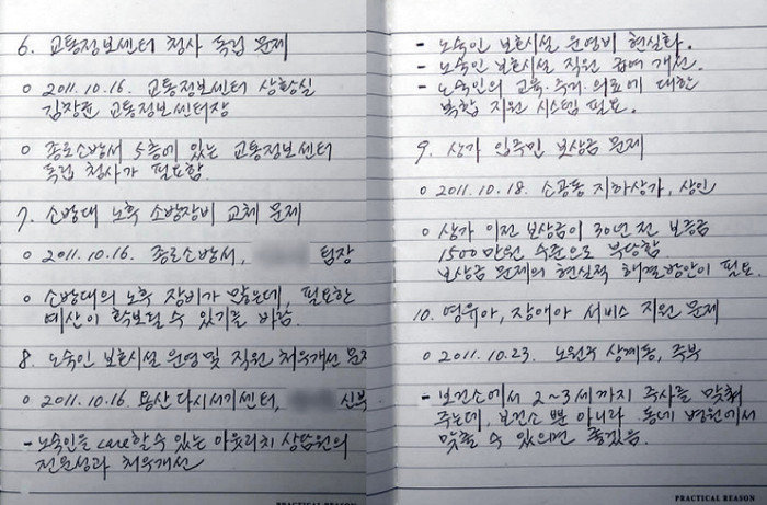 그의 수첩에는 개인택시 취득 자격요건에 대한 문제, 출퇴근시간 버스 전용차로의 실용성 개선, 공공 보육시설 확충 문제, 소방대 노후 장비 교체 문제, 노숙인 보호시설 운영 및 직원 처우개선 문제, 상가 입주민 보상금 문제 등이 포함됐다.