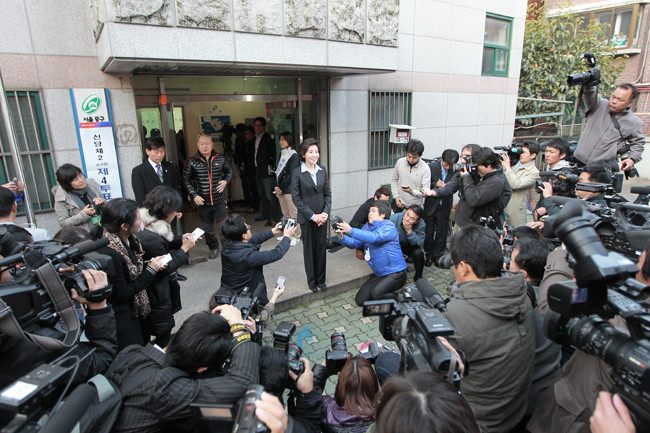 나경원 한나라당 서울시장 후보가 재·보궐 선거날인 26일 오전 서울 중구 신당동 장수경로당 투표소에서 투표를 마치고 기자들의 질문에 답하고 있다.