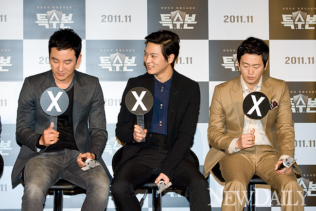 26일 오전 서울 롯데시네마 건대입구점에서 영화 ‘특수본(감독 황병국)’의 제작보고회가 열린 가운데 배우 엄태웅, 주원, 김정태가 기자회견을 갖고 있다.