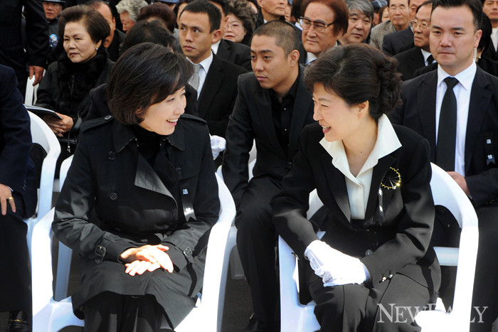 26일 오전 서울 동작구 국립현충원에서 열린 박정희 전 대통령 32주기 추도식에 참석한 가수 은지원이 박근혜 전 대표와 나경원 서울시장 후보 사이에 앉아 있다.