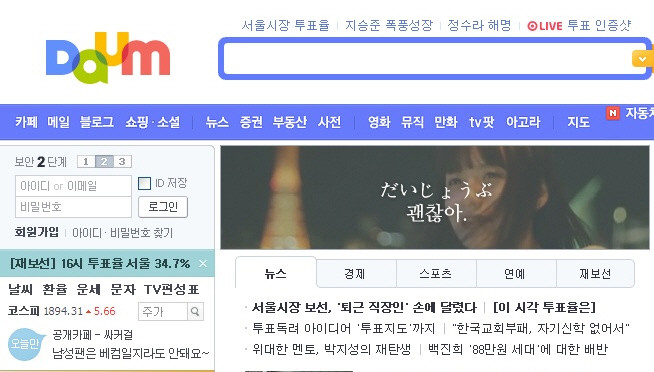 이날 5시30분께 다음은 메인 뉴스페이지에 '나경원 구하자 강남3구 치솟는 투표율'이란 기사와 '박원순측 羅에 열세 비상' 제하의 기사를 메인 톱기사로 배치했다.
