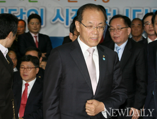 26일 지상파 방송 3사의 서울시장 보궐선거 출구조사 결과가 나경원 서울시장 후보에게 지극히 불리한 것으로 나타나자 한나라당 황우여 위원과 당지도부들이 개표상황실을 나서고 있다.