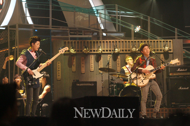28일 밤 서울 경희대학교 평화의전당에서 Mnet '슈퍼스타K3' 다섯 번째 생방송이 진행된 가운데 버스커버스커가 윤종신의 ‘막걸리나’를 열창하고 있다.
