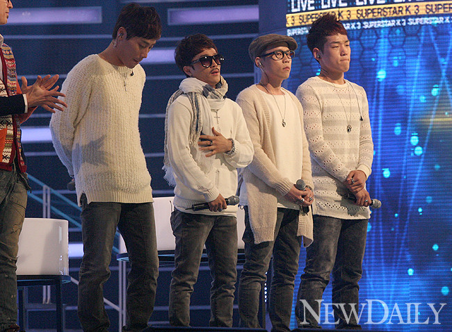 28일 밤 서울 경희대학교 평화의전당에서 Mnet '슈퍼스타K3' 다섯 번째 생방송이 진행된 가운데 울랄라세션이 심사위원진의 심사평을 듣고 있다.