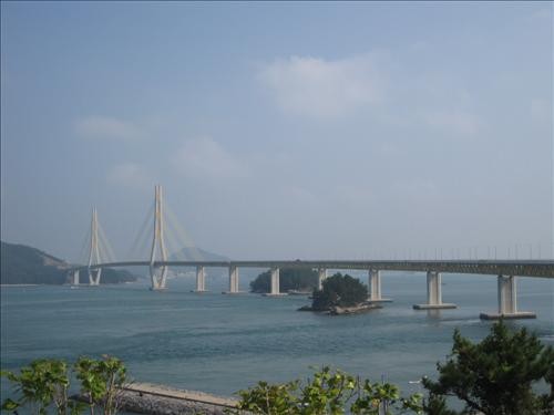 사장교(斜張橋)인 이 다리는 한복판에 167.5m 높이의 황금빛 주탑 2개가 우뚝 서서 각각 좌우의 케이블 다발로 바다 위 교량 상판을 팽팽하게 잡아당겨 떠받치는 구조다.