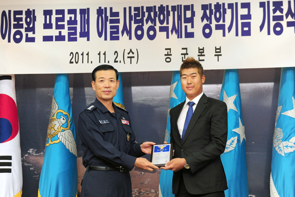 이동환 선수는 2일 오전, 계룡대 공군본부에서 ‘하늘사랑 장학재단’ 기금에 도신 골프토너먼트 우승상금 중 일부인 2,000만 원을 기탁했다. 박종헌 공군총장은 감사패와 함께 공군 조종사의 상징인 빨간마후라가 담긴 액자를 증정했다.