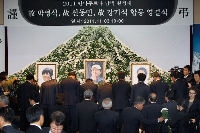 ◆안나푸르나 남벽 원정대, 합동 영결식 = 실종된 안나푸르나 남벽 원정대 박영석 대장과 강기석, 신동민 대원의 합동영결식이 3일 오전 종로구 혜화동 서울대병원 장례식장에서 산악인장으로 진행됐다. 유가족과 추모객들이 헌화를 하고 있다.
