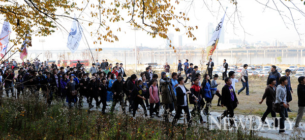 한미 FTA 비준 반대 시위가 열린 3일 오후 서울 여의도 국회로 진입을 시도하던 좌파 시위대들이 경찰의 저항에 부딪혀 이동하고 있다.