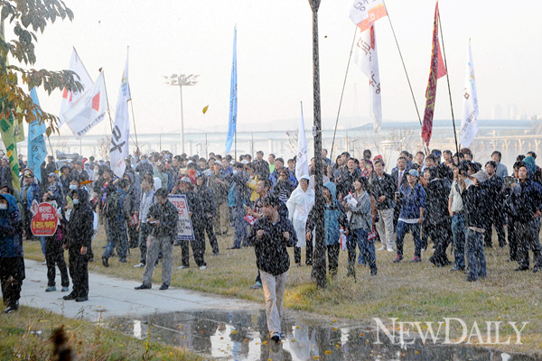 3일 오후 서울 여의도 국회 앞 둔치에서 한미 FTA를 반대하는 대학생들과 농민 시민사회단체 회원들이 국회 진입을 시도하다 물대포를 바라보고 있다.