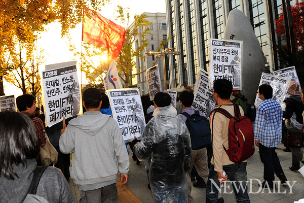 3일 오후 서울 여의도 국회 앞 둔치에서 한미 FTA를 반대하는 대학생들과 좌파 단체 회원들이 국회 진입을 시도하다 경찰의 저항에 부딪혀 이동하고 있다.
