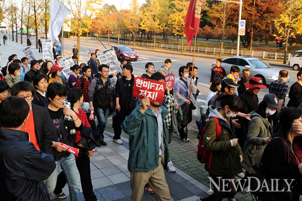3일 오후 서울 여의도 국회 앞 둔치에서 한미 FTA를 반대하는 대학생들과 좌파 단체 회원들이 국회 진입을 시도하다 경찰의 저항에 부딪혀 이동하고 있다.