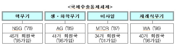 현재 세계 각국은 4대 국제수출통제체제를 운영 중이다. 회원국은 가입한 체제를 자국법에 반영해 전략물자의 수출을 통제한다. 우리나라는 4개 체제에 모두 가입돼 있다.