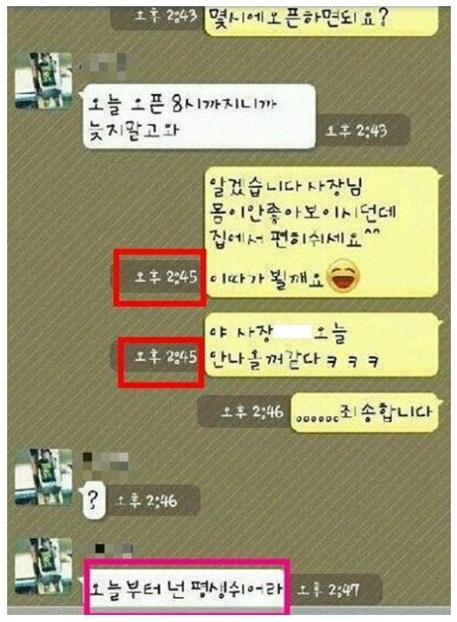 이에 사장님은 '물음표'로 의문을 표시한 뒤 "오늘부터 넌 평생 쉬어라"란 문자를 보내 극도로 분노한 모습을 보였다.