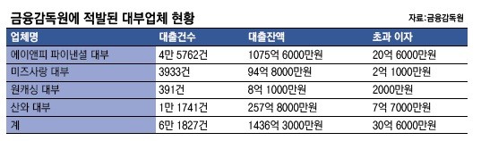 이번에 적발된 4개 대부업체의 고객은 115만6000명으로 전체 대부업체 이용자(330만7000명)의 절반이 넘는다. 또 대출규모도 3조5677억원으로 전체 대부업계 대출 총액(7조5655억원)의 47%에 달한다.
