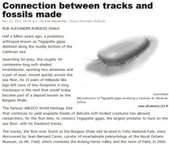 캐나다 새스캐처원 대학(University of saskatchewan) 니콜라스 민터(Nicholas Minter) 교수가 이끄는 연구팀은 현지시각으로 지난 10일 "브리티시컬럼비아주(British Columbia) 연안 요호 국립공원(Yoho National Park)의 고대 버지스 혈암지대(Burgess Shale)에서 바퀴벌레를 쏙 빼닮은 대형 절지동물(arthropod)의 발자국을 확인했다"고 영국 저널 '더 로얄 소사이어티 B(the Royal Society B)'에 발표했다.