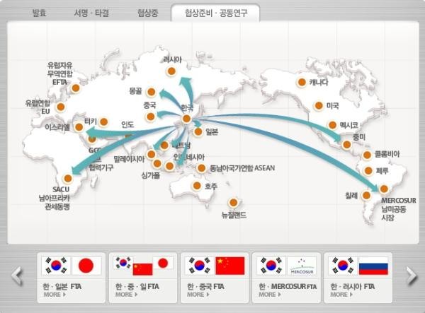 ■ FTA협상준비 및 공동연구 국가: 韓-일본FTA, 韓-중국FTA, 韓-中-日FTA, 韓-MERCOSUR TA, 韓-러시아 BEPA, 韓-SACU FTA, 韓-베트남FTA, 韓-몽골FTA, 韓-중미FTA, 韓-이스라엘FTA, 韓-말레이시아FTA, 韓-인도네시아FTA -