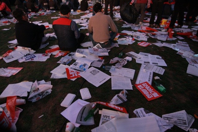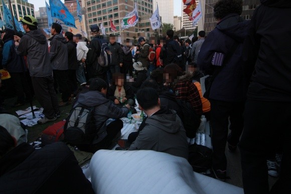 하지만 일부 참가자들은 보도블록 바닥에 돗자리 등을 깔고 소주 맥주 막걸리 등 온갖 종류의 술과 안주가 등장하는 술판을 벌여 거리를 지나는 시민들의 눈살을 찌푸리게 했다. 집회인지 도심 야유회인지 구분이 가지 않는다. 집회가 끝나면 어김없이 소주병, 맥주 캔, 막걸리 용기 등이 어지럽게 광장에 나뒹군다.