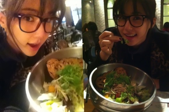 사진 속 공현주는 화장기 없는 민낯에 뿔테 안경을 쓰고 야채 샐러드를 맛있게 먹고 있다.