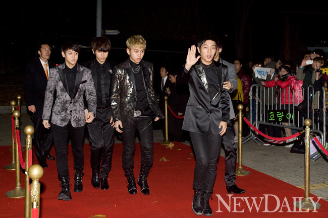 21일 저녁 서울 송파구 올림픽공원에 위치한 올림픽홀에서 ‘2011 대중문화예술상’ 시상식이 열린 가운데 아이돌그룹 비스트가 레드카펫을 지나고 있다.