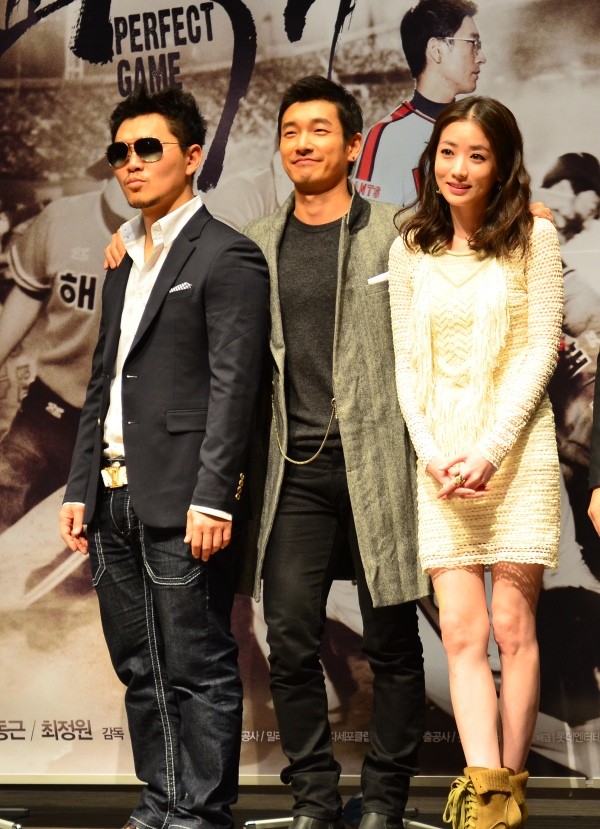 지난 21일 오전 서울시 광진구 롯데시네마 건대점에서 열린 영화 '퍼펙트 게임' 제작발표회에서 배우 조승우, 양동근, 최정원이 포토타임을 갖고 있다.