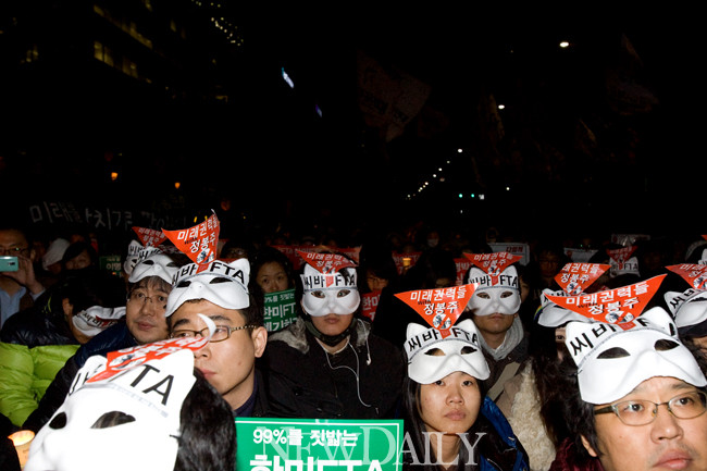 이날 집회에는 약 1,000여명의 시민들이 촛불과 피켓, 깃발을 들고 한미 FTA 비준 동의안 통과를 강력히 규탄했다.
