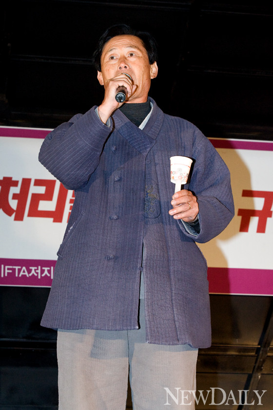 22일 오후 7시 서울 여의도 산업은행 앞에서 한미 FTA 비준 동의안 강행처리에 반발하는 시민들이 촛불집회를 가진 가운데, 전국농민회 이광석 의장이 시민들에게 연설을 하고 있다.