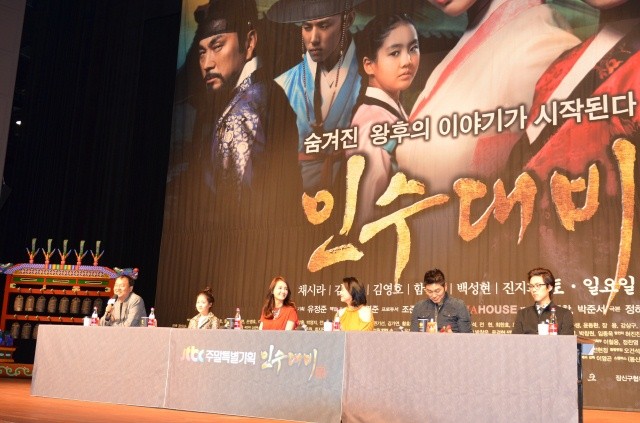 24일 오후 서울 서초구 서초동 국립국악원 예악당에서 열린 JTBC 개국 주말 특별기획 드라마 '인수대비' 제작발표회에 참석한 출연진이 기자회견을 갖고 있다.