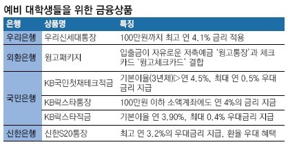 우리은행은 예비대학생을 위한 상품 '우리신세대통장'을 판매하고 있다. 체크카드 혹은 신용카드 결제계좌를 우리신세대통장 계좌로 유지하고 전월 1회 이상 승인 실적이 있으면 100만원까지 최고 연 4.1%의 금리가 적용된다. 소액에도 높은 금리가 적용되는 것이 이 상품의 특징이다. 수수료 면제(월 10회) 혜택도 받을 수 있다. 가입 대상은 18∼30세 고객이다.