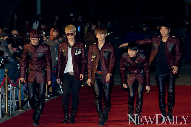 24일 저녁 7시 서울 송파구 올림픽공원 체조경기장에서 '2011 멜론뮤직어워드(MelOn Music Awards)' 시상식이 열린 가운데 아이돌 그룹 비스트가 레드카펫을 지나고 있다.