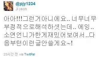 ◆지연 초성글 해명 "그런 거 아니에요" =논란이 커지자 지연은 다시 트위터에 글을 올려 "너무 부정적으로 해석하셨다"며 "그런 뜻이 아니"라고 해명했다.