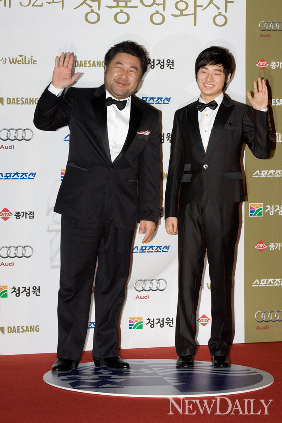 25일 저녁 서울 경희대학교 평화의 전당에서 '제 32회 청룡영화상' 시상식이 열린 가운데 배우 고창석과 이다윗이 포토세션을 갖고 있다.