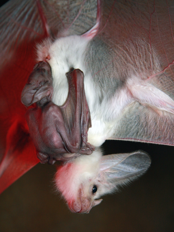그러나 자세히 살펴보면 아기 박쥐의 검붉은 피부는 아직 외피가 제대로 자라지 않아 몸 속 혈관이 그대로 비친 것임을 알 수 있다.