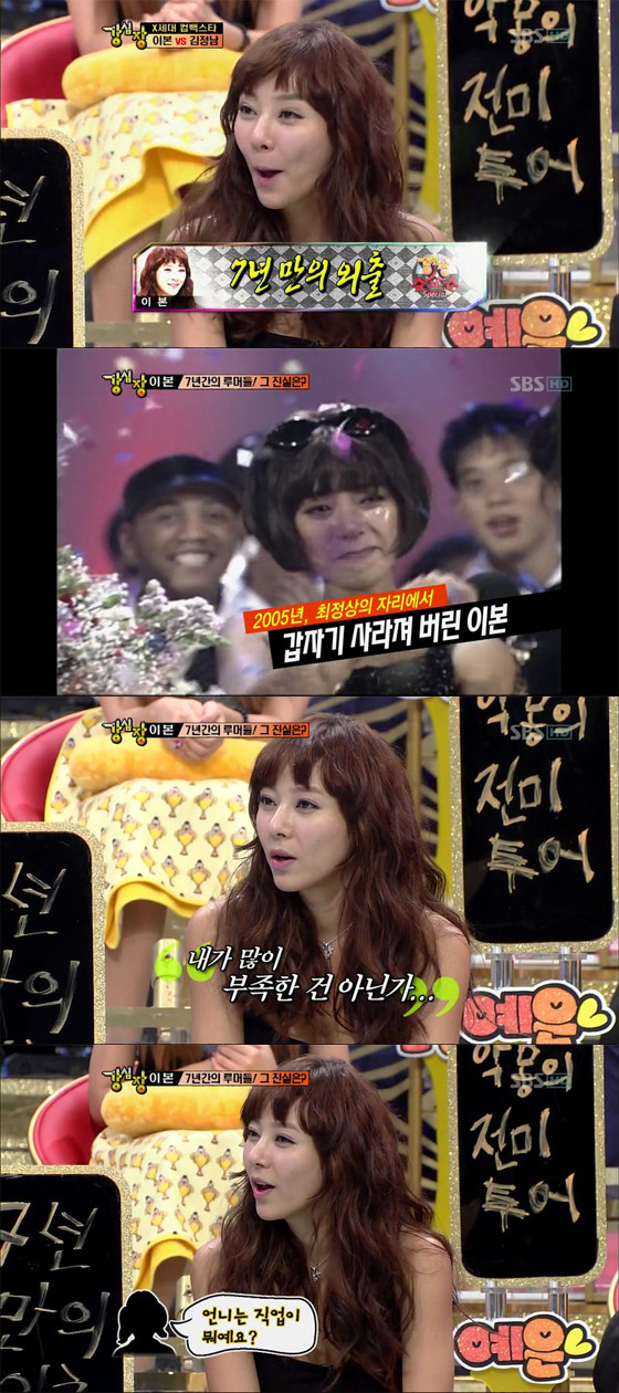 지난 29일 밤 방송된 SBS 예능프로그램 ‘강심장’에 출연한 이본은 ‘7년 만의 외출’이란 주제로 자신의 과거 이야기를 털어놨다.