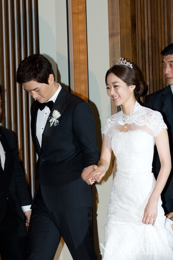 2일 오후 서울 신라호텔에서 배우 유지태와 김효진 커플의 결혼식에 앞서 기자회견이 열린 가운데 유지태와 김효진이 입장하고 있다.