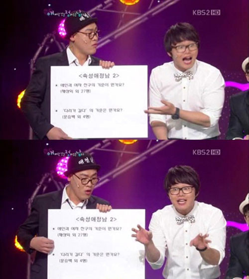 이어 최효종은 “애인과 여자 친구는 물에 빠졌을 때 구별할 수 있다”며 “물에 빠졌을 때 뛰어들고 싶으면 애인이고, 무언가 기다란 것을 던져주고 싶으면 여자 친구다”라고 기준을 제시해 폭소케했다.