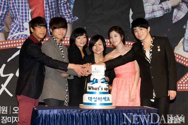 6일 오후 서울 강남구 논현동에 위치한 헤리츠 웨딩컨벤션에서 MBN주말드라마 '왓츠업'의 제작 발표회가 열린 가운데 연출을 맡은 송지원, 장미자 감독과 배우 오만석, 대성, 임주은, 조정석이 대성 팬들이 준비한 케이크를 컷팅하고 있다.