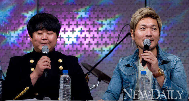 7일 오후 서울 서초 잠원동에 위치한 리버사이드 호텔에서 ‘2011 임재범 리메이크 앨범[ 풀이(Free..)]'의 쇼케이스가 열린 가운데 개그맨 신동수와 가수 임재범이 기자회견을 갖고 있다.