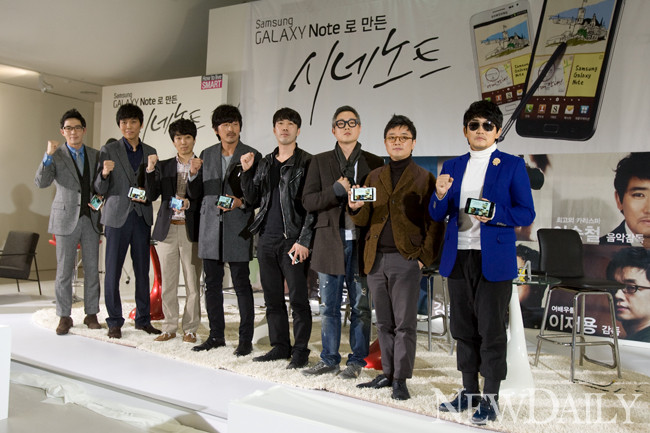8일 오후 서울 서초구 서초동에 위치한 부띠크모나코 미술관에서 ‘갤럭시 노트로 만든 시네노트’의 제작 발표회가 열린 가운데 참석자들이 포토세션을 갖고 있다.