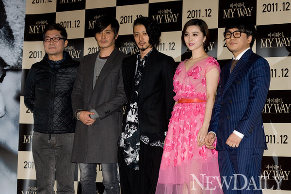 13일 오후 서울 왕십리CGV에서 영화 ‘마이웨이’의 언론시사회 및 기자간담회가 열린 가운데 강제규 감독, 배우 장동건, 오다기리 조, 판빙빙, 김인권이 포토세션을 갖고 있다.