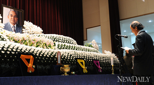 [뉴데일리] 양호상 기자 = 故 박태준 명예회장 영결식이 17일 오전 서울 동작동 국립묘지 현충관에서 열린 가운데 조정래 작가가 조사를 낭독하고 있다.