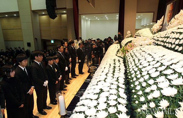 [뉴데일리] 양호상 기자 = 故 박태준 명예회장 영결식이 17일 오전 서울 동작동 국립묘지 현충관에서 열린 가운데 고인의 손자 손녀들이 헌화후 묵렴을 하고 있다.