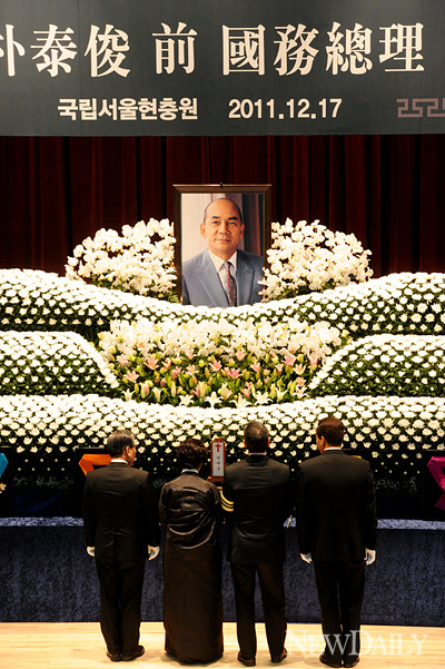 [뉴데일리] 양호상 기자 = 故 박태준 명예회장 영결식이 17일 오전 서울 동작동 국립묘지 현충관에서 열린 가운데 부인 장옥자씨와 아들 박성빈씨가 분향하고 있다.