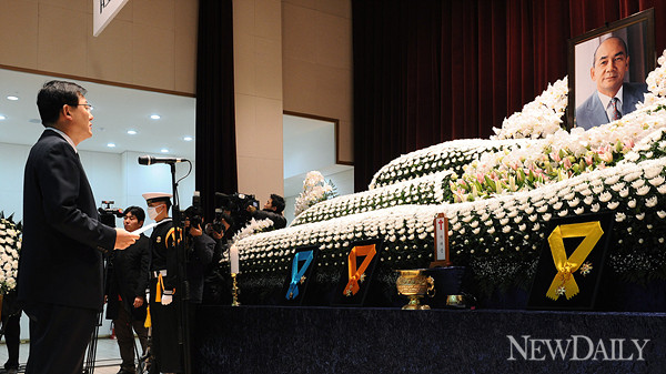 [뉴데일리] 양호상 기자 = 故 박태준 명예회장 영결식이 17일 오전 서울 동작동 국립묘지 현충관에서 열린 가운데 홍석우 지식경제부 장관이 조사를 낭독하고 있다.