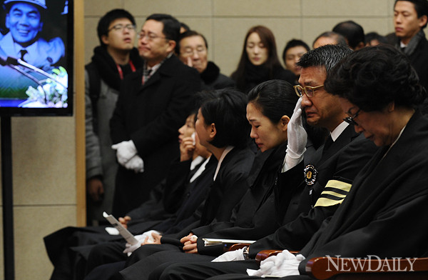 [뉴데일리] 양호상 기자 = 故 박태준 명예회장 영결식이 17일 오전 서울 동작동 국립묘지 현충관에서 열린 가운데 유가족들이 고인의 추모영상을 보며 눈물을 흘리고 있다.